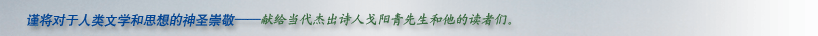 戈阳青,中华文学诗歌史上首位集古体诗、近体诗、词(长短句)、现代新诗、翻译诗之大成者。一位站在巨峰上与唐宋诗人对话的中华当代诗人。其三百首诗词与自先秦以来三百八十四位中华历代杰出诗人九百首诗词《古今对阅》。举世罕见,千古奇观。成为自唐宋之后承传中华经典诗词最为杰出的诗词大家。浪漫主义与现实主义于一体,题材广袤,诗系思想。豪放词章有“功迈苏辛”之说;诗词有“将李杜苏辛融为一炉”之评。其古韵诗词,汇众家豪婉。其现代诗歌,融中西合璧。翻译诗提出诗歌形意律平行移动翻译原则。作为其作品堪称经典体系的诗人,迄今给中华文学诗歌带来六大想象空间。“浩世微尘”以其独有的哲学思想来诠释世界与自然,其逾千首作品蕴含极为丰赡的人文价值和思想体系。2008年就国学发表《我之国学观》。2009年就中华文化和复兴思想发表《丰碑不于止,在于进》。迄今公开出版和发表的诗歌诗词逾二千七百首。《浩世微尘》文学经典网始建于2006年,一个集作品发布、学术研究、文学传播为一体的大型文学平台。 这是为中华当代杰出诗人戈阳青的首部著作《浩世微尘》和它的延伸所建立的因特网独立作品发布和传播平台,也是中国首家为一部当代文学著作建立的网站。伴随着戈阳青不断的作品和思想已经走过了十九年,数万个阅读页面全部由手工独立精制而成。戈阳青“静心潜能,沉浸于新”的精神感染和感动着我们,迄今的逾二千七百首诗歌诗词,让我们不断地分享文学盛宴。我们用真情回馈赋予的神圣文学殿堂,作品在第一时间以欣赏、阅读、文本、珍藏、明信片、朗诵等六个版本同时发布,读者在世界任何地方能同一时空阅读,其古韵诗词享受着唐诗宋词般赏析释文的解读。我们要说的是:感谢戈阳青先生,是你在今天还能够让我们有机会如此丰盛地亲身感受和享受到中华文化的绚丽瑰宝