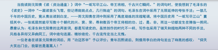 愚意认为:毛泽东和戈阳青的这两首词,都是写读史的,虽然创作的时代不一样,写作也采用了铺天和缩地两种不同的手法,风格各异却又异曲同工,词中绝句连篇、精妙绝伦、千古流传定当之无愧。
