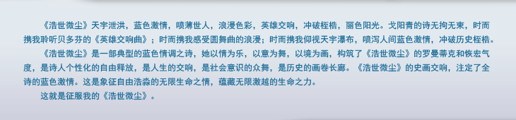 《浩世微尘》是一部典型的蓝色情调之诗,她以情为乐,以意为舞,以境为画,构筑了《浩世微尘》的罗曼蒂克和恢宏气度,是诗人个性化的自由释放,是人生的交响,是社会意识的众舞,是历史的画卷长廊。《浩世微尘》的史画交响,注定了全诗的蓝色激情。这是象征自由浩淼的无限生命之情,蕴藏无限激越的生命之力。
