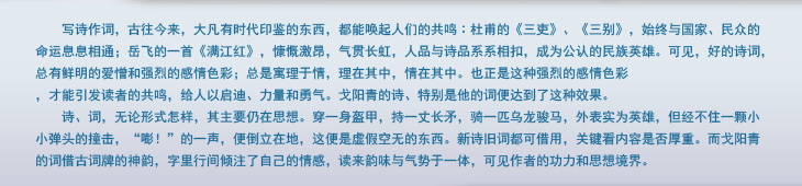 写诗作词,古往今来,大凡有时代印鉴的东西,都能唤起人们的共鸣∶杜甫的《三吏》、《三别》,始终与国家、民众的命运息息相通;岳飞的一首《满江红》,慷慨激昂,气贯长虹,人品与诗品系系相扣,成为公认的民族英雄。可见,好的诗词,总有鲜明的爱憎和强烈的感情色彩;总是寓理于情,理在其中,情在其中。也正是这种强烈的感情色彩,才能引发读者的共鸣,给人以启迪、力量和勇气。戈阳青的诗、特别是他的词便达到了这种效果。