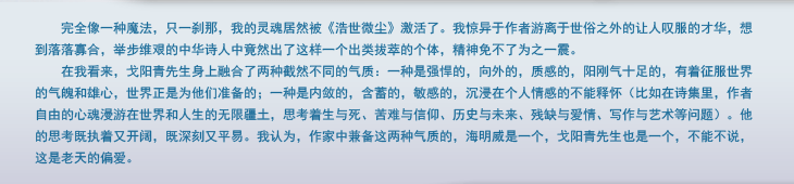 完全像一种魔法,只一刹那,我的灵魂居然被《浩世微尘》激活了。我惊异于作者游离于世俗之外的让人叹服的才华,想到落落寡合,举步维艰的中华诗人中竟然出了这样一个出类拔萃的个体,精神免不了为之一震。戈阳青先生的书不是简单的文字能够概括、能够诠释的。无论是作为现代传媒的Internet,还是被古人视作可以藏之名山,传之后人的书卷,能够提供给我们的,都只是靠近和体悟一颗包容着深遂思想与丰富情感的心灵的途径。至于我的这篇文字,可套用上“管中窥豹,略见一斑”这个词,权当受这块智慧的多米诺骨牌击倒之人的一点随想吧!