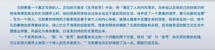戈阳青是一个真正写诗的人。正如狄尔泰在《生存哲学》中说:诗“满足了人的内在渴求,当命运以及他自己的抉择仍然把他束缚在既定的生活程序上时,他的想象则使他去过他永远也不能实现的生活。诗开启了一个更高的境界,展示出新的远景”。作为一个诗人,戈阳青所特有的才能表现在善于做个人的内心体验,能够从磨难中发掘生命的深度,吸取命运的一切,使平凡的事物也变得意味深长。诗人伫立于有限的经验世界,想象的释放却拥抱了无限的超验和永恒,在灰暗苦涩的散文式生活中提炼出诗意,并晶化为具体意象,以优美的诗的形式表现出来。