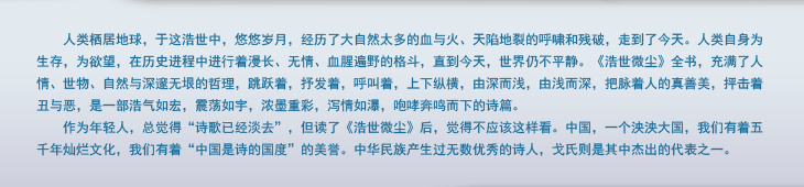 作为年轻人,总觉得“诗歌已经淡去”,但读了《浩世微尘》后,觉得不应该这样看。中国,一个泱泱大国,我们有着五千年灿烂文化,我们有着“中国是诗的国度”的美誉。中华民族产生过无数优秀的诗人,戈氏则是其中杰出的代表之一。 |
