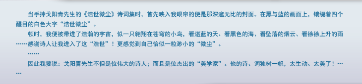 因此我要说:戈阳青先生不但是位伟大的诗人;而且是位杰出的“美学家”。他的诗、词独树一帜,太生动、太美了!…… |