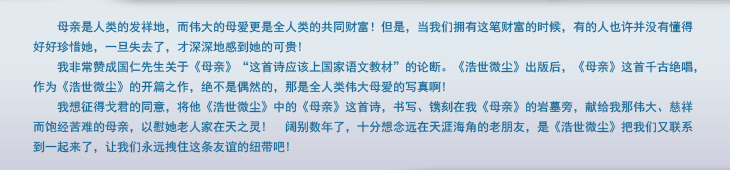 我非常赞成国仁先生关于《母亲》“这首诗应该上国家语文教材”的论断。《浩世微尘》出版后,《母亲》这首千古绝唱,作为《浩世微尘》的开篇之作,绝不是偶然的,那是全人类伟大母爱的写真啊!