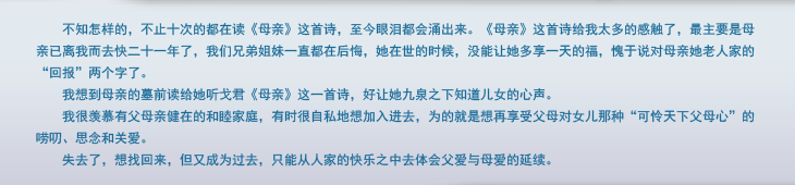 戈君的诗与词,我这样的水平是不敢评论的,但我昨晚失眠了,今天一早起来,一口气写完了对“母亲”的思念。不知怎样的,不止十次地都在读《母亲》这首诗,至今眼泪都会涌出来。《母亲》这首诗给我太多的感触了,最主要是母亲已离我而去快二十一年了,我们兄弟姐妹一直都在后悔,她在世的时候,没能让她多享一天的福,愧于说对母亲她老人家的“回报”两个字了。