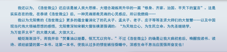 我为之庆幸的《浩世微尘》从隆重出版到短短时日的轰动共鸣感应的效益,当之无愧。笔至于此,我还要动议天下关心爱护这部有思想的灵魂振荡,有灵魂的思想舞蹈,在激切的诚盼中,让东方中国最高文学奖和西方的诺贝尔文学奖的评委们,调动真情实感,看看、读读、听听,《浩世微尘》越盛唐、超宋朝、跨元明清……至今难觅的浩歌绝响。可以说,《浩世微尘》诗集是泱泱大中华盛世天年孕育出来的杰出代表作,她膺获中国以及诺贝尔大奖是功成名就,顺天应地的认可。诚如西方有志之士,1988年诺贝尔奖金得奖主精英们在巴黎发表的大会宣言声称:“人类必须回到2500多年前去寻找孔夫子的智慧,才能找到挽救人类于没顶”。我以为戈阳青的《浩世微尘》更多的蕴含着消化了的孔夫子、孟夫子、老子、庄子等等圣贤大师们的大智慧……以及中国现当代伟大领袖思想的感悟,戈阳青深知宋朝大儒张横渠强调的:“为天地立心,为生民立命。为先圣继绝学,为万世开太平”的大德大诚,大信大义。