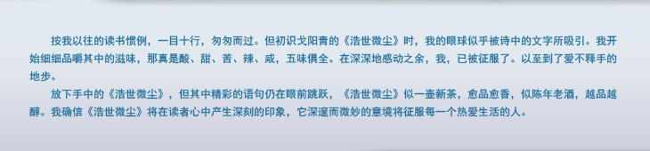 《浩世微尘》,但其中精彩的语句仍在眼前跳跃,《浩世微尘》似一壶新茶,愈品愈香,似陈年老酒,越品越醇。我确信《浩世微尘》将在读者心中产生深刻的印象,它深邃而微妙的意境将征服每一个热爱生活的人。 |