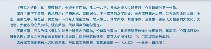 愿诗化思想家的诗人戈阳青先生,写出意志集聚的、文化底蕴的……《天仁》……更多千古绝唱! |
