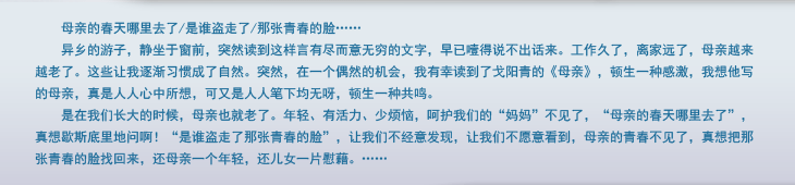 我们阅读“母亲”,我们在作品里称“母亲”,“妈妈”离我们越来越遥远。可是一想,是在我们长大的时候,母亲也就老了。年轻、有活力、少烦恼,呵护我们的“妈妈”不见了,“母亲的春天哪里去了”,真想歇斯底里地问啊!“是谁盗走了那张青春的脸”,让我们不经意发现,让我们不愿意看到,母亲的青春不见了,真想把那张青春的脸找回来,还母亲一个年轻,还儿女一片慰藉。母亲的青春残存于我们的记忆,母亲的青春的底片被岁月冲洗。