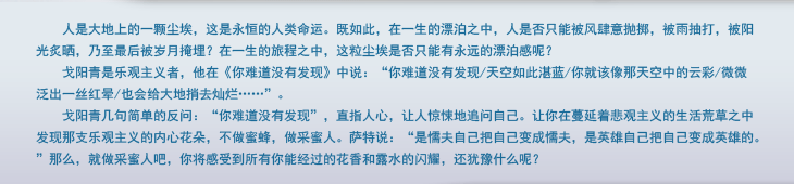戈阳青几句简单的反问:“你难道没有发现”,直指人心,让人惊悚地追问自己。让你在蔓延着悲观主义的生活荒草之中发现那支乐观主义的内心花朵,不做蜜蜂,做采蜜人。萨特说:“是懦夫自己把自己变成懦夫,是英雄自己把自己变成英雄的。”那么,就做采蜜人吧,你将感受到所有你能经过的花香和露水的闪耀,还犹豫什么呢? |