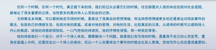 戈阳青这本诗集,可以看到他在写诗的时候,是表达了很真实的思想情绪,而这种思想情绪更多的还是表达对现实事件的看法,包括自己的情感生活,包括对他的家庭,或者对他的爱情,对他的生活,比较真实的记录,从读诗的时候可以感到诗人内心的焦虑。读他的诗感到很轻松,一口气把他的诗读完,他的抒情性很强,有一种美的享受。
