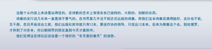 我们这本诗集装璜得挺好,定价也不低,五千册,在召开座谈会之前,我们出版社库存就只有12本,要送作协的领导,只找出12本来,后来为筹集这个会,到处搜罗,才弄到了30多本,所以新闻界的朋友直到今天才拿到书。