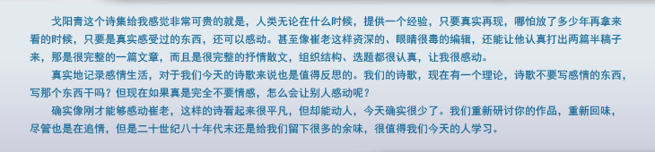 戈阳青这个诗集给我感觉非常可贵的就是,人类无论在什么时候,提供一个经验,只要真实再现,哪怕放了多少年再拿来看的时候,只要是真实感受过的东西,还可以感动。甚至像崔老这样资深的、眼睛很毒的编辑,还能让他认真打出两篇半稿子来,那是很完整的一篇文章,而且是很完整的抒情散文,组织结构、选题都很认真,让我很感动。