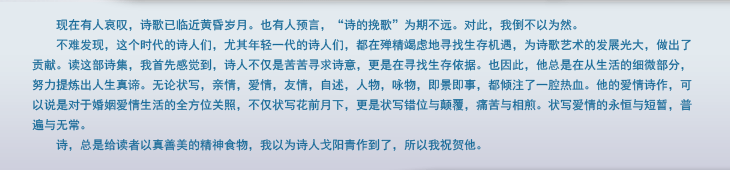 诗,总是给读者以真善美的精神食物,我以为诗人戈阳青作到了,所以我祝贺他。 |