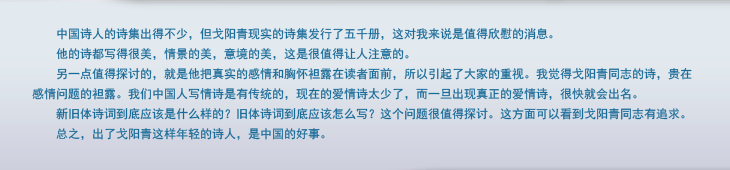 另一点值得探讨的,就是他把真实的感情和胸怀袒露在读者面前,所以引起了大家的重视。我觉得戈阳青同志的诗,贵在感情问题的袒露。我们中国人写情诗是有传统的,现在的爱情诗太少了,而一旦出现真正的爱情诗,很快就会出名。