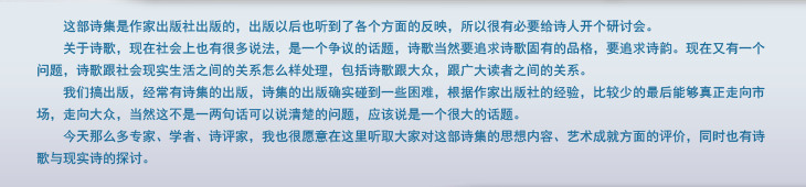 这部诗集是作家出版社出版的,出版以后也听到了各个方面的反映,所以很有必要给诗人开个研讨会。