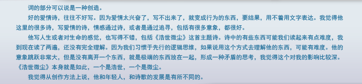 《浩世微尘》本身就是如此,一个是浩世,一个是微尘。我觉得从创作方法上说,他和年轻人,和诗歌的发展是有所不同的。 |
