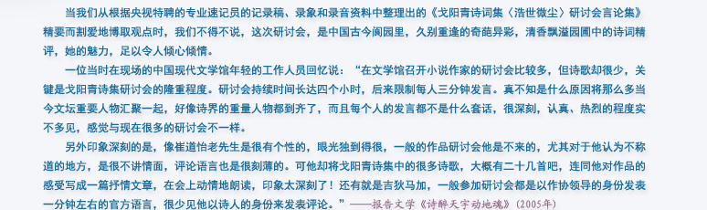 当我们从根据央视特聘的专业速记员的记录稿、录象和录音资料中整理出的《戈阳青诗词集〈浩世微尘〉研讨会言论集》精要而割爱地博取观点时,我们不得不说,这次研讨会,是中国古今阆园里,久别重逢的奇葩异彩,清香飘溢园圃中的诗词精评,她的魅力,足以令人倾心倾情。 一位当时在现场的中国现代文学馆年轻的工作人员回忆说:“在文学馆召开小说作家的研讨会比较多,但诗歌却很少,关键是戈阳青诗集研讨会的隆重程度。研讨会持续时间长达四个小时,后来限制每人三分钟发言。真不知是什么原因将那么多当今文坛重要人物汇聚一起,好像诗界的重量人物都到齐了,而且每个人的发言都不是什么套话,很深刻,认真、热烈的程度实不多见,感觉与现在很多的研讨会不一样。 另外印象深刻的是,像崔道怡老先生是很有个性的,眼光独到得很,一般的作品研讨会他是不来的,尤其对于他认为不称道的地方,是很不讲情面,评论语言也是很刻薄的。可他却将戈阳青诗集中的很多诗歌,大概有二十几首吧,连同他对作品的感受写成一篇抒情文章,在会上动情地朗读,印象太深刻了!还有就是吉狄马加,一般参加研讨会都是以作协领导的身份发表一分钟左右的官方语言,很少见他以诗人的身份来发表评论。”