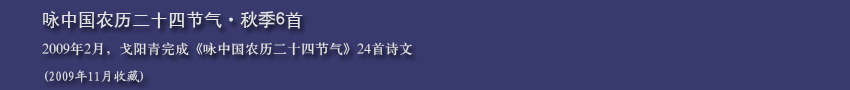 “《咏中国农历二十四节气》·春季6首”、“《咏中国农历二十四节气》·夏季6首”、“《咏中国农历二十四节气》·秋季6首”、“《咏中国农历二十四节气》·冬季6首”已经先后于3月5日惊蛰、5月5日立夏、8月7日立秋、11月7日立冬之日公开发表。至此,《咏中国农历二十四节气》24首诗文已经全部公开发表。 |