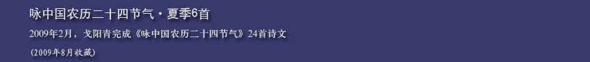二十四节气是中华民族古代科学智慧和人文智慧的结晶,也是中华民族传统文化的重要部分之一。几千年来,无论是在农耕时代的过去,还是在科学发展日新月异的今天,一直影响着中国人的生活,同时也是中华民族对于世界人文与科学的重要贡献。春季的立新与惊蛰,夏季的兴旺与收获,秋季的成熟与凋零,冬季的冥藏与蛰伏,象微着大自然与世间万物和世间万象的生死、悲欢与轮回;二十四个节气更是以其浩瀚与微茫的寓意和博大精深的蕴涵,冥冥中影响着世间人们的生活。应该说,对于这样一个厚重题材,自古以来的诗人自然无法忽视。但或许由于二十四节气多为简单的农耕背景,且基本内容重复甚多,因而很难捕捉到丰韵的诗意。所以,从古至今还没有一位诗人做到了以寓意深刻、唯美动人的诗文来集中吟咏。可以说,完成这一厚重题材是中国诗人的千年梦想,而戈阳青先生却实现了这一梦想。