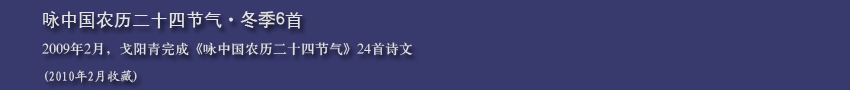 2010年2月20日,《浩世微尘》文学经典网发布《浩世微尘》收藏专题欣赏页面“《咏中国农历二十四节气》·冬季6首”。2009年2月,戈阳青完成《咏中国农历二十四节气》24首新古韵诗文,实现中国诗人的千年梦想……