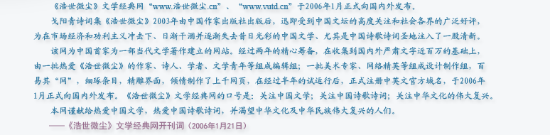 2006年,精心筹备两年的《浩世微尘》文学网经典网注册中英文官方域名“www.浩世微尘.cn” 、“www.vutd.cn”,于1月21日正式向国内外发布。这无疑为热爱《浩世微尘》及戈阳青诗歌诗词艺术的人们提供了一个珍贵的交流平台。仅进入2月,浏览量就突破了万人次。
