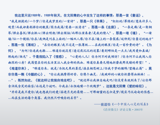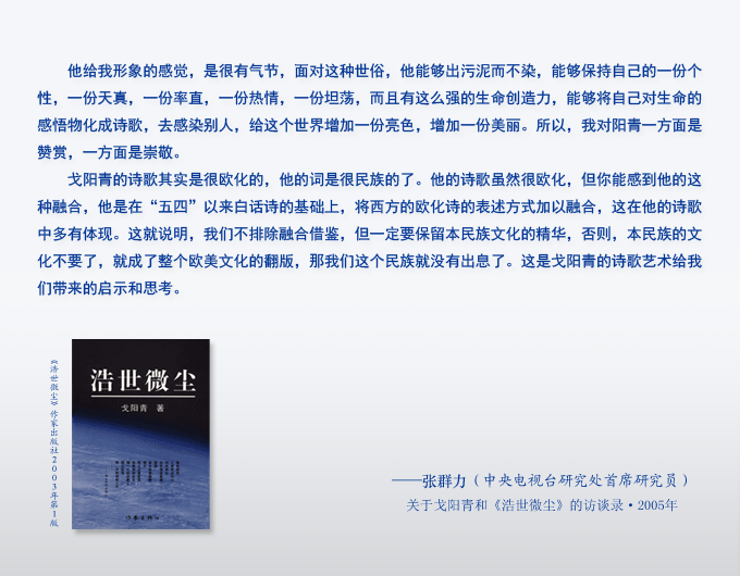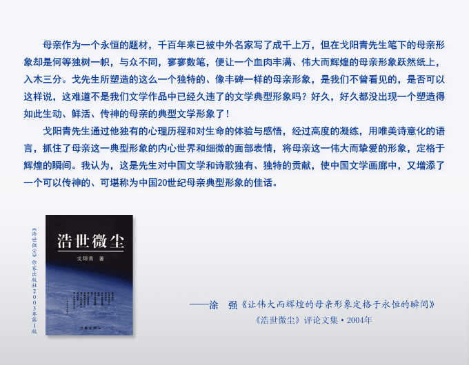 1990年6月2日,戈阳青作诗《浩世微尘》,收入《浩世微尘》作家出版社2003年第1版。