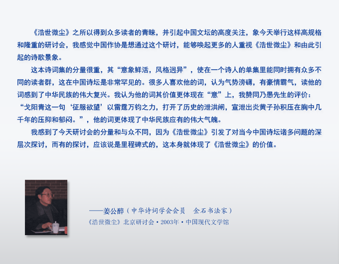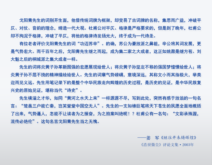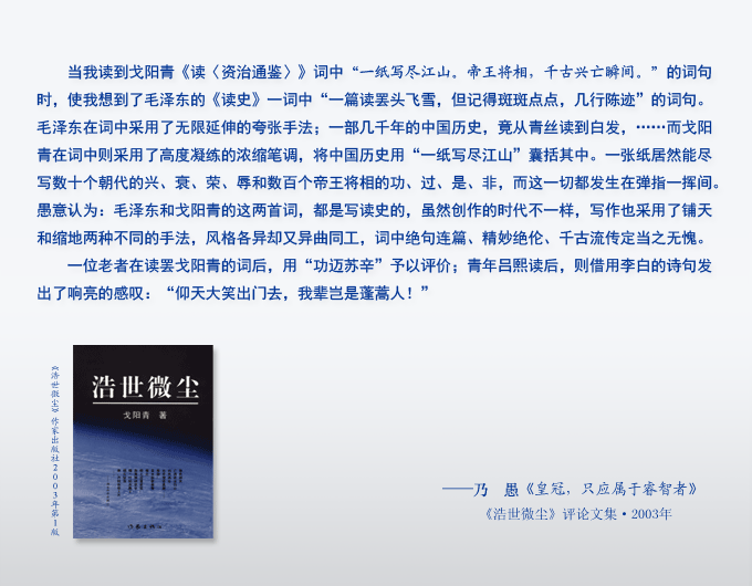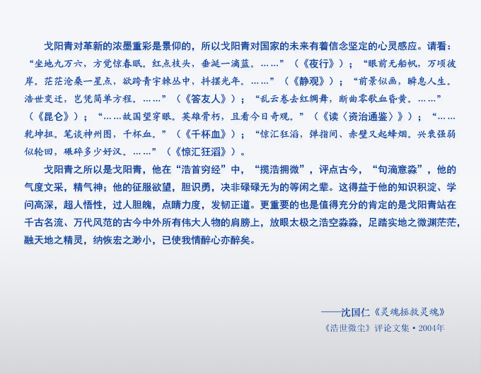 河北石红在读了《浩世微尘》并不断读到戈阳青新作后,给网站的留言中感叹到:“戈阳青先生在《浩世微尘》中,多以纯情委婉的新诗感人情怀;以豪气冲天的词章撼人心魄;以译笔华丽的翻译诗合壁中西。而戈阳青先生在他的新作里,又多以潇洒俊逸的新七言诗、新五言诗韵景抒怀,为中国的人文地理吟出诸多绝唱!诗风如此迥异而集于一人之身,且多为杰作、精品和传世之作,这在中国诗歌史上是罕见的,或者说是绝无仅有的!”