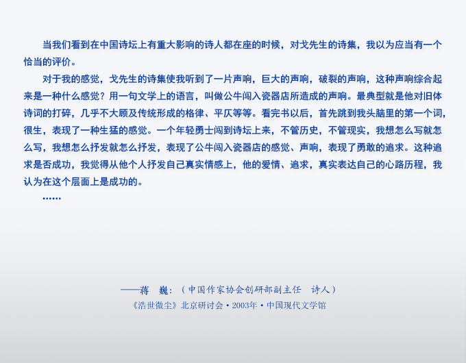 自古以来,英雄与美人总是人们浓墨重彩的至爱,也因为有了他们,让一个国家和民族更加富有了传奇与浪漫色彩。而多以豪放诗词著称的戈阳青,对于唯美情致的审视竟如此之高,着实让我们尤为惊叹!在《倾城倾国》一诗中,戈阳青为我们描绘了一幅“倾城倾国”绝色佳人的审美图,其神形兼备的至美意境,在古今的诗词中也是极为罕见的。让我们再作一次赏析吧:“风送来了桃花红晕到美人的容颜,但(若要为倾城倾国之美啊,这还不够)还要有窈窕花姿,似若牡丹;但(若要为倾城倾国之美啊,这还不够)还要有冰美之颜,亭亭玉兰之雅,一笑便可让整个城国为之动容啊;但(若要为倾城倾国之美啊,这还不够),还要有紫叶墨菊的高贵,月光下的万般柔洁,群芳丛中的独领娇艳。”作家萧然认为,就人性美而言,英雄代表了一个国家和民族阳刚美的极致;而美人则代表了一个国家和民族阴柔美的极致。他认为,在当今数字化美人和产业化美人盛行的时代,人们更多地缺失了对于女性之美的富有内涵的审美标准,尤其对于代表国家和民族女性之美的评判趋于随意。戈阳青《倾城倾国》的诗,以至美的意境,塑造了一个理想中的绝世佳人的形象,我们需要不断完善对于女性美的审美情致,才有可能唤起人们对于女性美的真正尊重。