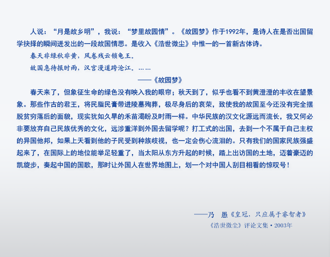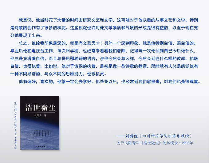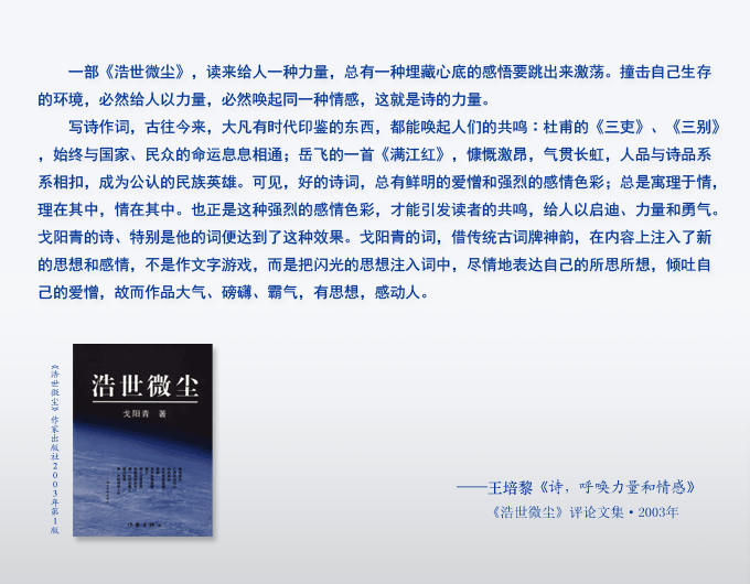 戈阳青对于秋天有着特殊的情怀,早期新诗多有吟秋之作,后又发表古韵《咏中国农历二十四节气·秋季六首》。文艺评论家乃愚在《浩世微尘》后记《皇冠,只应属于睿智者》中有这样的一段文字:“戈阳青的诗歌(此指《浩世微尘》诗歌部分——编者注)分为三个乐章:婉约图画、爱情绝唱和昏红的世界。诗人在春、夏、秋、冬四季中最喜爱秋天,他以为秋天有着无穷无尽、延绵不绝的丰富蕴涵:金色的收获、枯萎的冥想、连绵的沉思、孕育的希望……以至于诗人总爱把他早期的新诗,喻为昏红世界的绚丽画卷。‘…… 于是,如果世界一片昏红,便成为血与火的缠绵。而幽暗世界里的残亮,就点燃了那光灿灿的画卷。’——《如果世界一片昏红》”