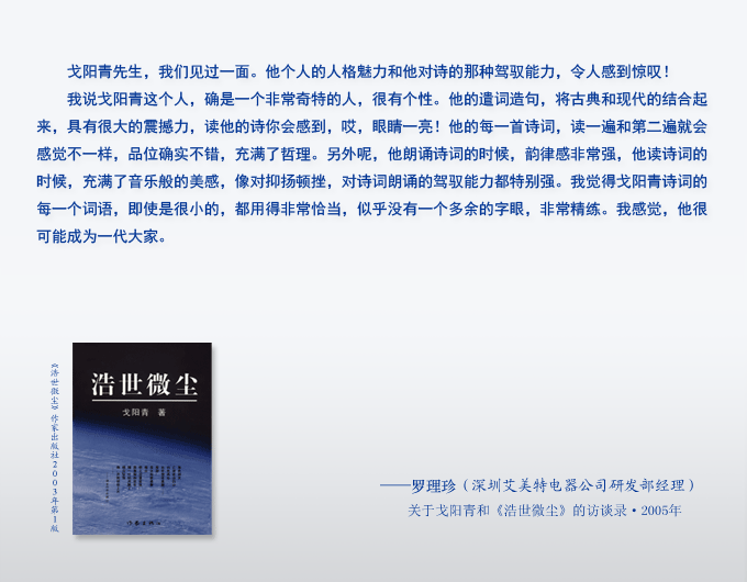 戈阳青说:“文学首先是神圣而无价的。只要不是商业利益,如果愿意,我的诗词你可以随意取之,用之。”