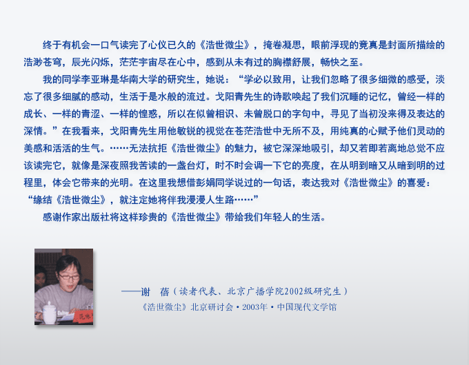 2003年,读者陶宣在《浩世微尘》评论文章中,写下了意蕴连绵的标题:“只有开始,没有终止”。