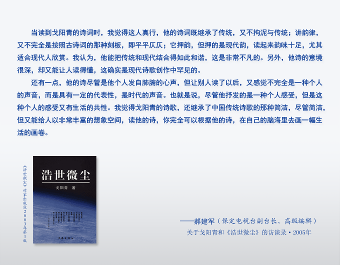 文章写道:“然而,一个诗人的出现打破了中国诗坛的寂寞,给中国诗坛带来了一线希望的曙光,这个诗人就是戈阳青。戈阳青的诗歌作品,既继承了古典诗歌追求完美艺术表达的形式感,又没有落入对古典诗歌的窠臼之中。《浩世微尘》将中国古典诗歌的音律美、节奏感、结构完整和谐与西方诗歌自由、奔放、洒脱的艺术风格完美地结合起来,既体现了新诗向传统古典诗歌的回归,也体现了融汇中西、融通古今的艺术追求,为新诗走出散文化(即散文分行书写)的困境指明方向。”