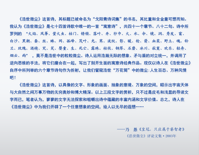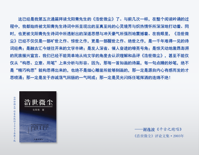 然而,一个诗人的出现打破了中国诗坛的寂寞,给中国诗坛带来了一线希望的曙光,这个诗人就是戈阳青。2003年诗人戈阳青出版了诗集《浩世微尘》,一时间好评如潮,作家出版社、《诗刊》社、中国作家协会创研部、中国现代文学馆曾联合为这部诗集召开专题研讨会,《文艺报》在以整版篇幅推出了题为《解读戈阳青诗集〈浩世微尘〉》的专拦,刊载了李瑛、吉狄马加、谢冕、崔道怡、叶延滨、韩作荣、蒋巍、程步涛、阎纲、马萧萧、丁国成、朱先树、查干等十三位中国著名诗人、评论家在《浩世微尘》作品研讨会上的发言摘要。文艺评论家乃愚教授率先在题为《皇冠,只应属于睿智者》的文章中,认为戈阳青的豪放诗词“功迈苏辛”。《人民日报》海外版评论称:“戈阳青歌唱亲情、爱情,回首童年,思考人生。与会的诗人、评论家认为其诗作意象鲜活,意境悠远,寓含深沉的思想,表达感人的情怀。其词作气势恢弘,意境深远,表达了爱国情怀和中华民族自立于世界民族之林的坚定信念。”《中国新闻出版报》报道:“《浩世微尘》被誉为‘一部21世纪震撼人心的诗词经典;一曲灵魂洗礼振奋精神的绝响浩歌;一首青丝白发跨越时空的恢弘乐章’,与会的数十位中国文学界的专家、学者及评论家对《浩世微尘》都给予了高度评价,认为《浩世微尘》风格迥异,意象鲜活;意境悠远,思想深邃。”这些评论无疑是准确而中肯的。然而,在笔者看来,这些评论还没有将《浩世微尘》放在几千年的中国诗歌发展的历史长河来进行观照,并没有充分地意识《浩世微尘》在文学史上的开创性意义。